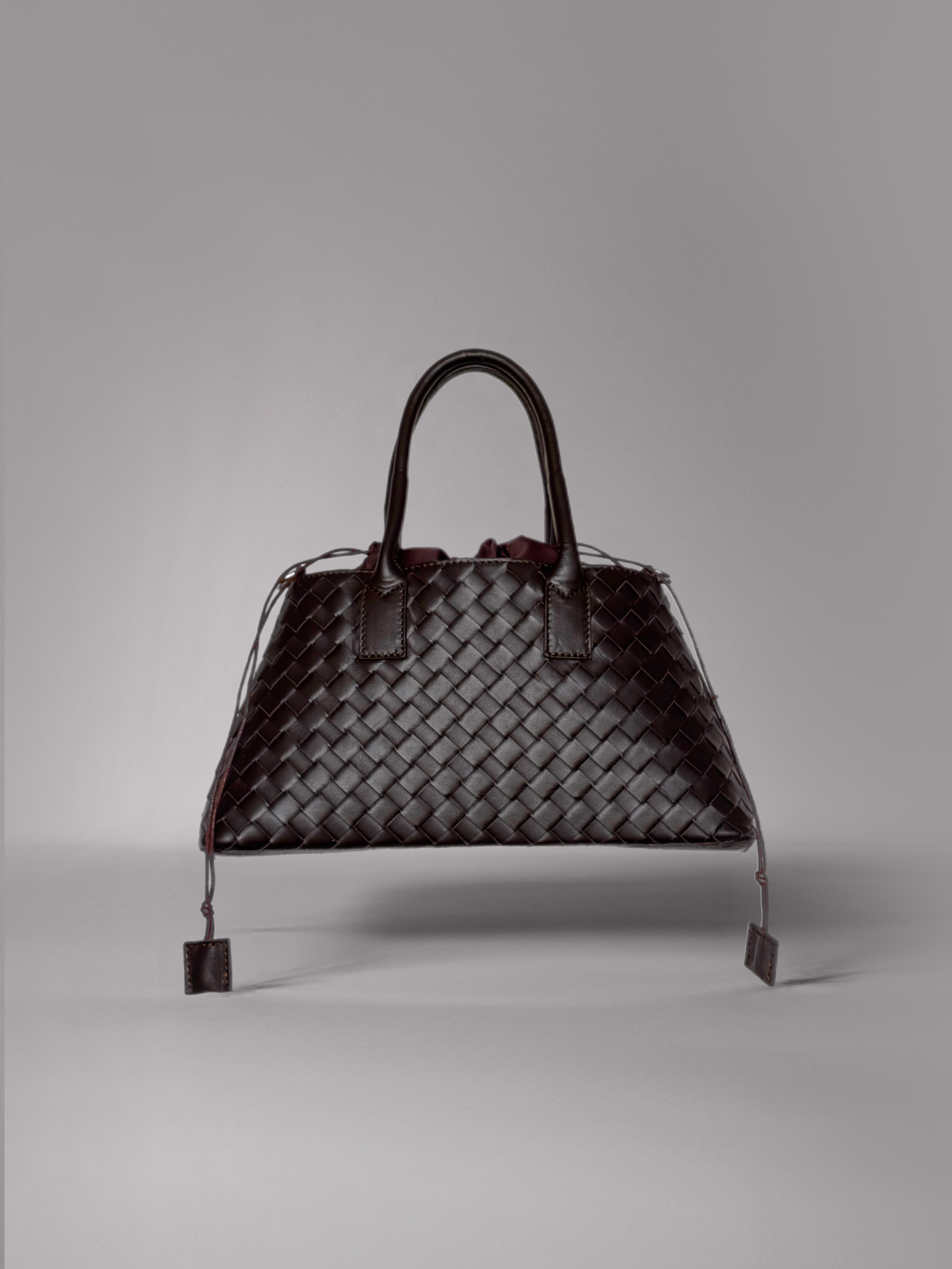 A woven structure in dark chocolate tones. The Altair is crafted from soft calf leather with an inner drawstring pouch, combining texture and simplicity.