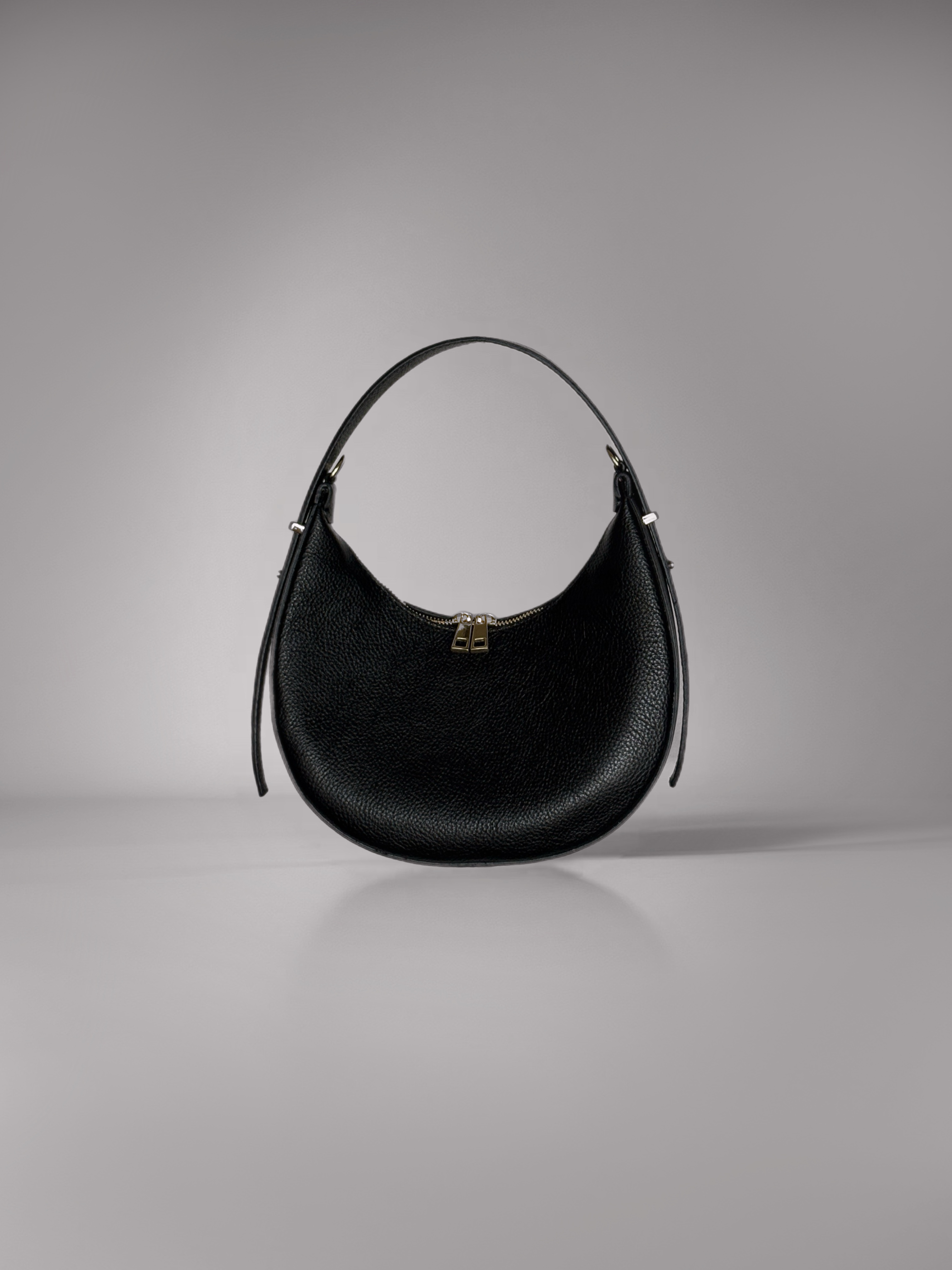 Defined lines, balanced proportions. The Seren bag holds its crescent shape with a firm yet refined structure. Crafted from calf leather, it features two interchangeable straps for shoulder or crossbody wear.